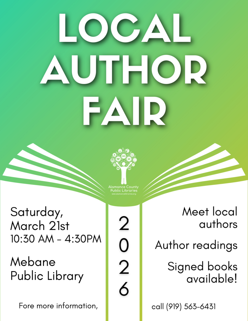 Saturday March 21, 2026 at Mebane Public Library from 10:30 a.m. – 4:30 p.m. A schedule of author reading will be shared closer to the event date.
