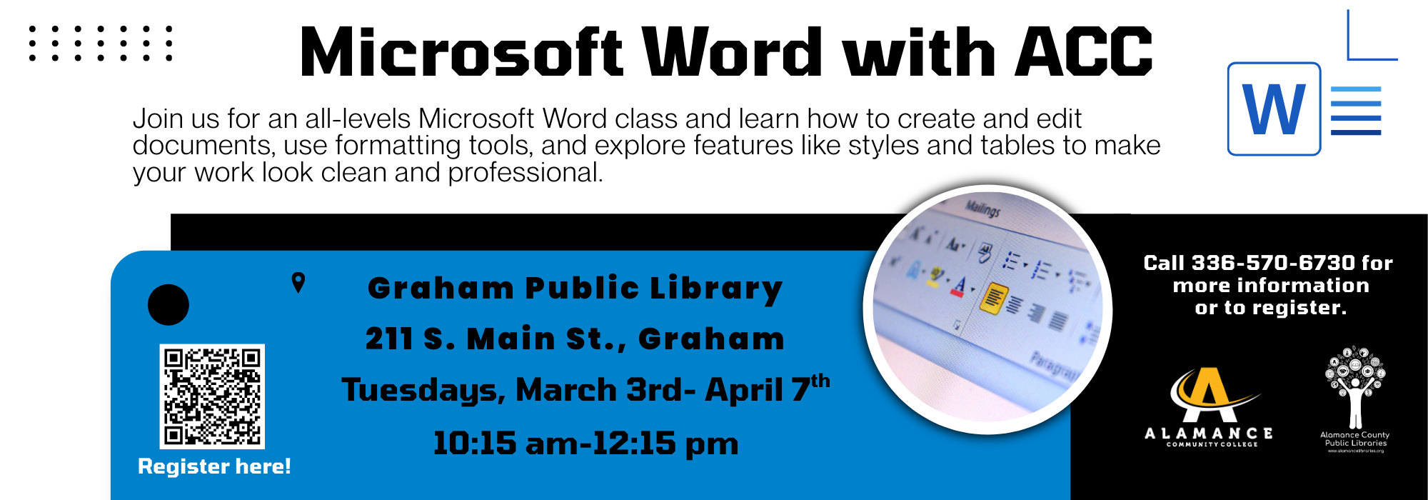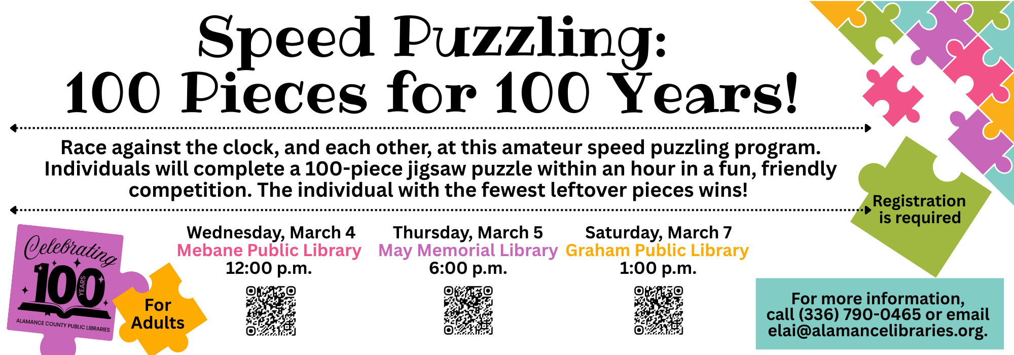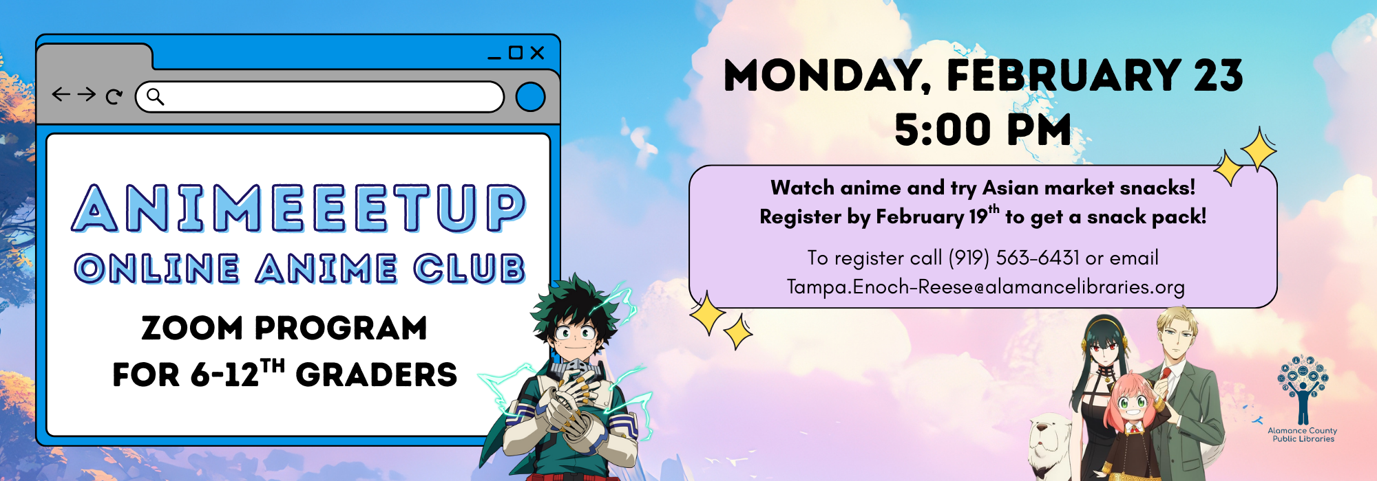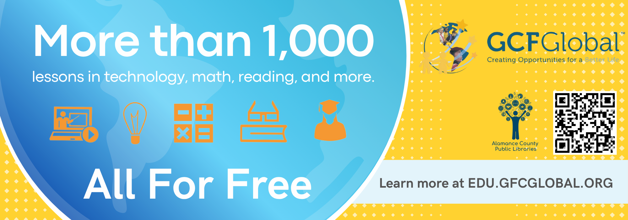 Phone: 336-229-3588 ext. 16109 or ask for Outreach | e-mail: outreach@alamancelibraries.org
