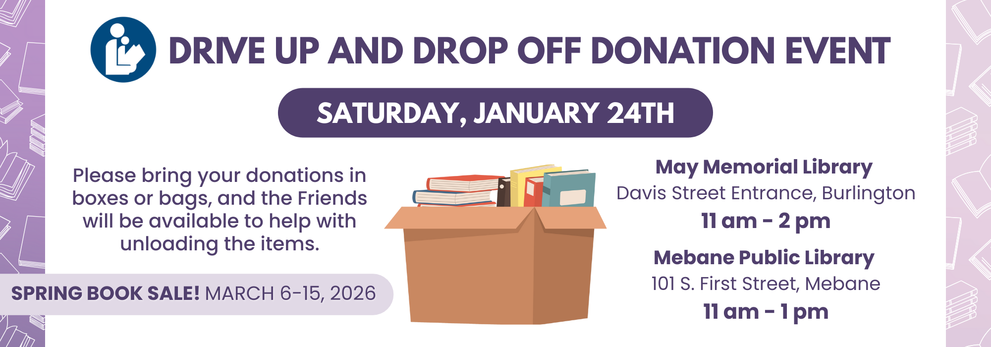 Phone: 336-229-3588 ext. 16109 or ask for Outreach | e-mail: outreach@alamancelibraries.org