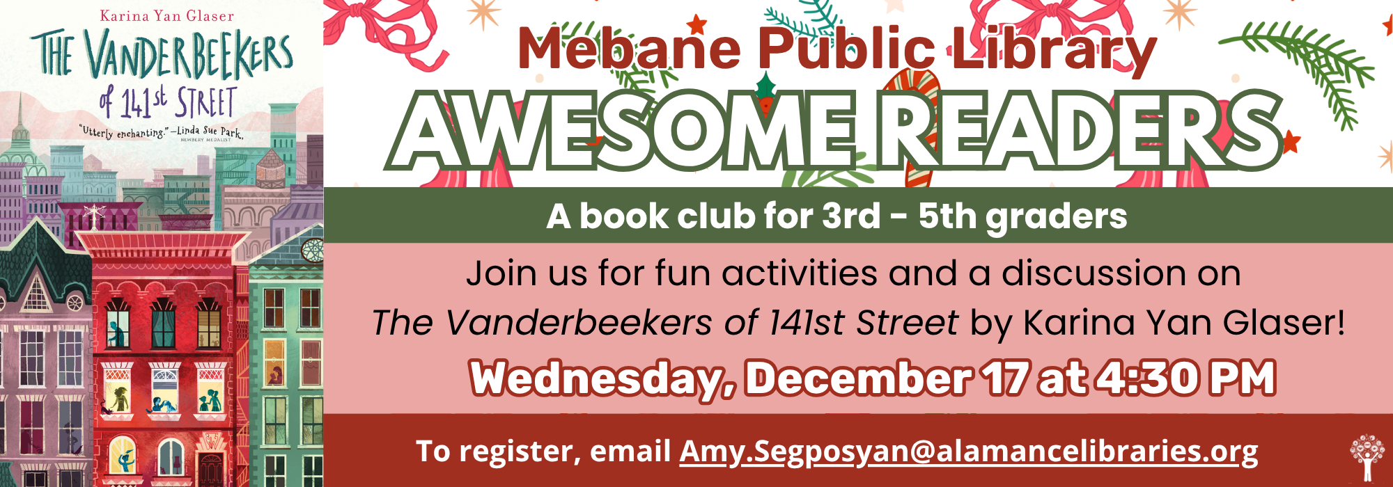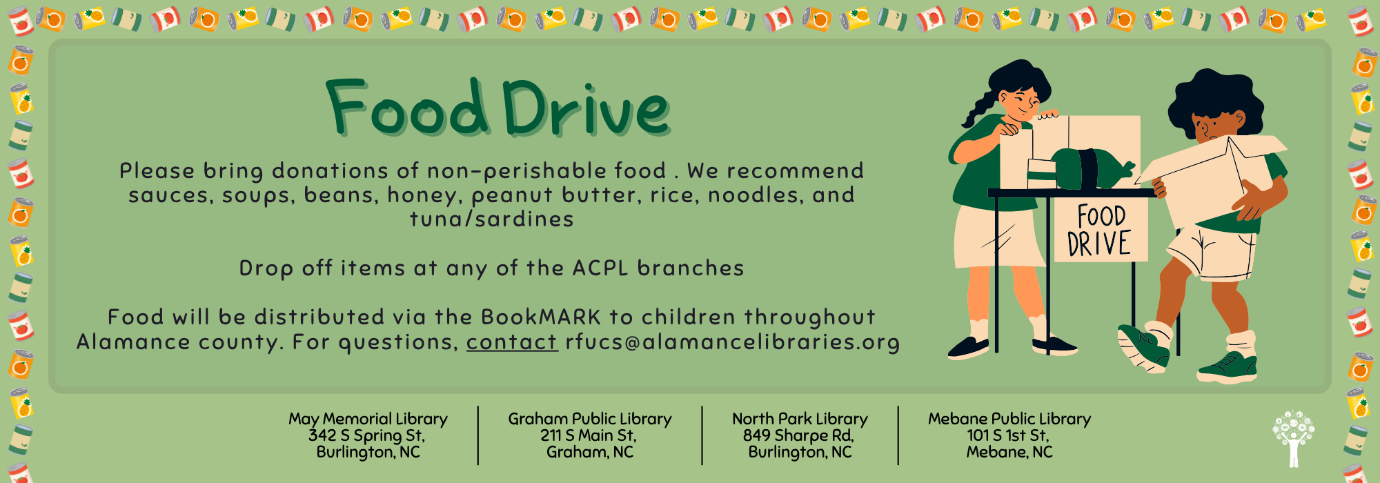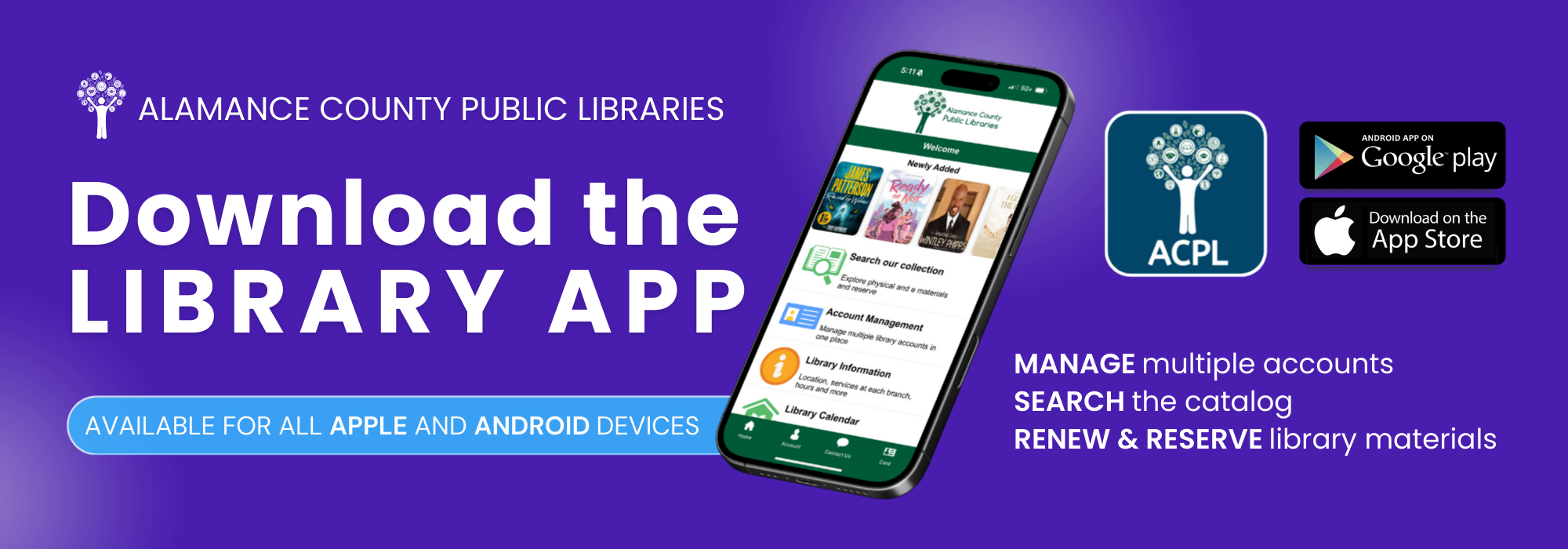 Phone: 336-229-3588 ext. 16109 or ask for Outreach | e-mail: outreach@alamancelibraries.org