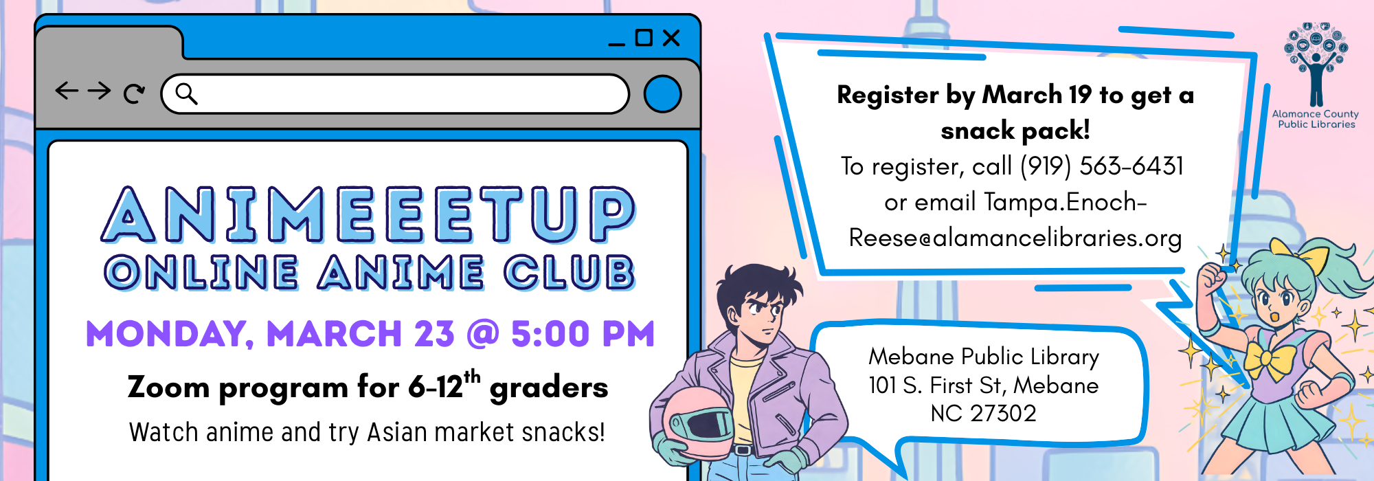 Phone: 336-229-3588 ext. 16109 or ask for Outreach | e-mail: outreach@alamancelibraries.org