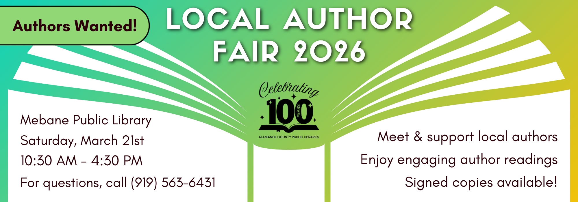 Phone: 336-229-3588 ext. 16109 or ask for Outreach | e-mail: outreach@alamancelibraries.org