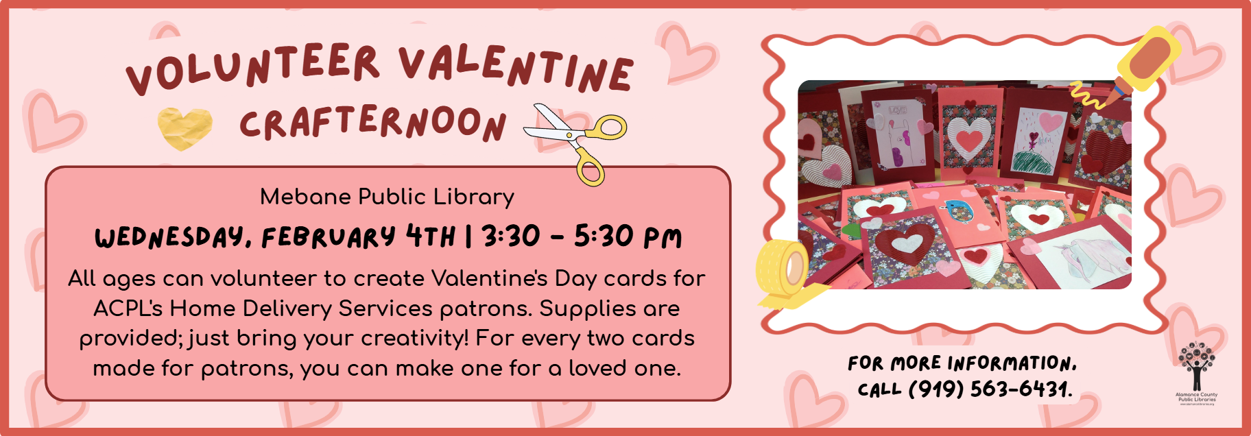 Phone: 336-229-3588 ext. 16109 or ask for Outreach | e-mail: outreach@alamancelibraries.org